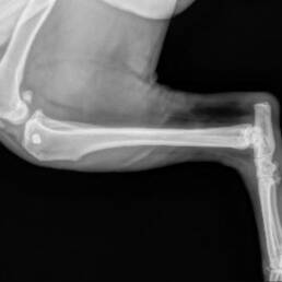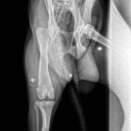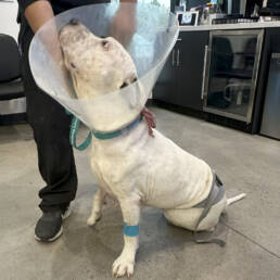 Soon after rescue, Rocky began limping badly on his right hind leg. The veterinary team discovered a torn ACL (Anterior Cruciate Ligament) and mild hip dysplasia on top of the buckshot wounds. During surgery, his torn ligament was repaired, the visible pellets were removed, and he was also neutered to prepare him for a brighter future.
