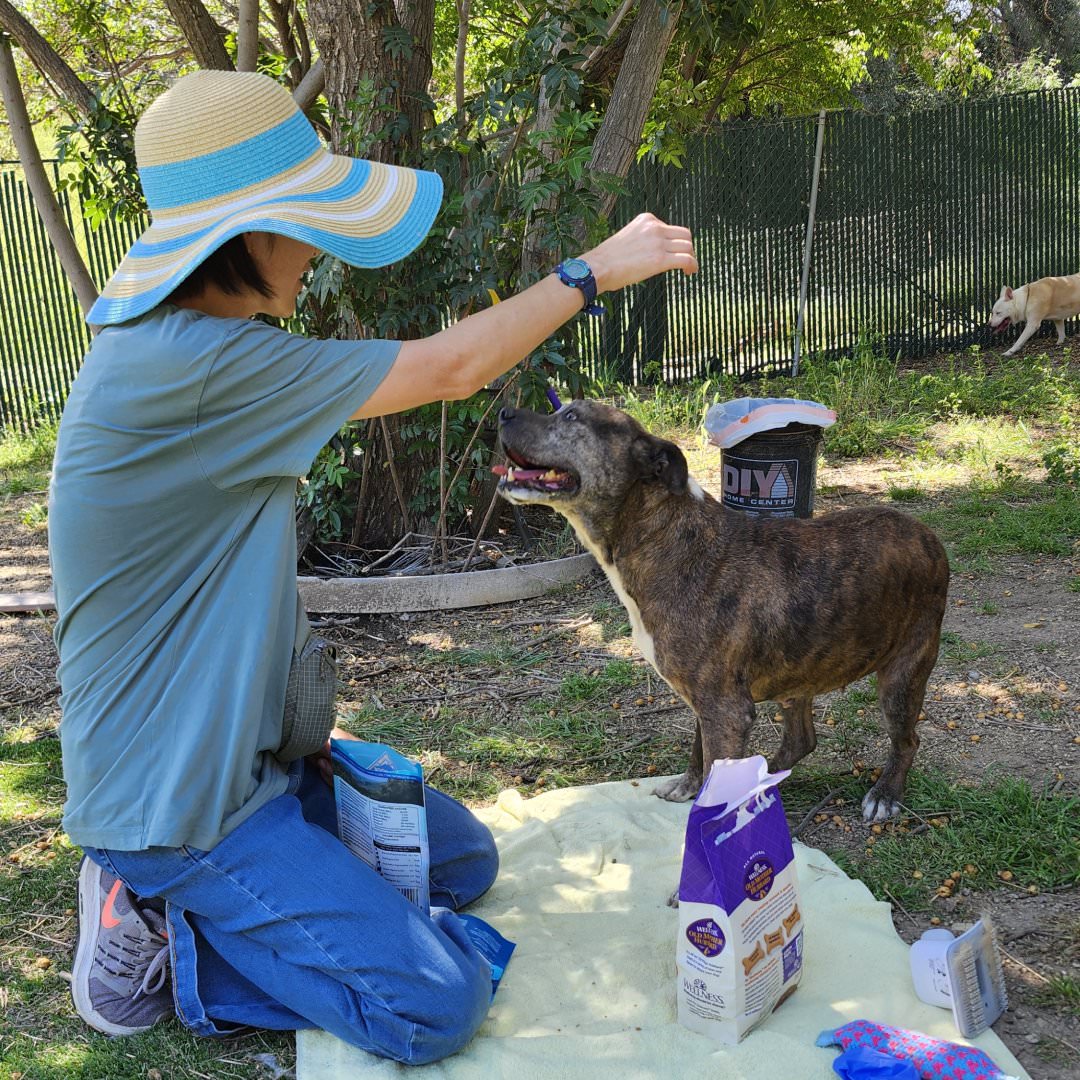She loves treats and takes them delicately, enjoys exploring the play yard at a relaxed pace, and meets other dogs with calm, friendly confidence.