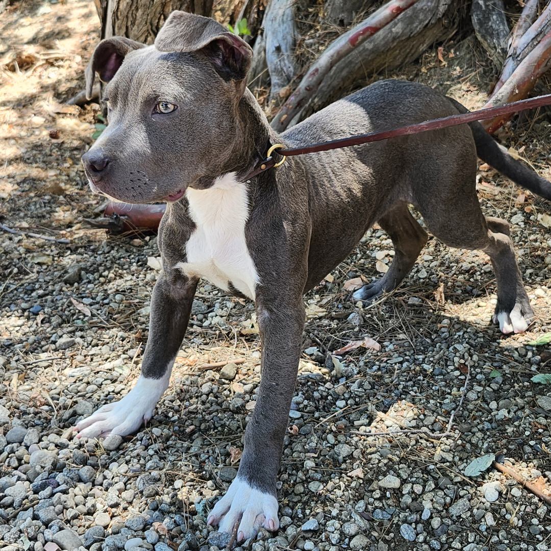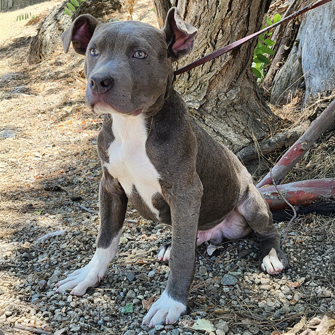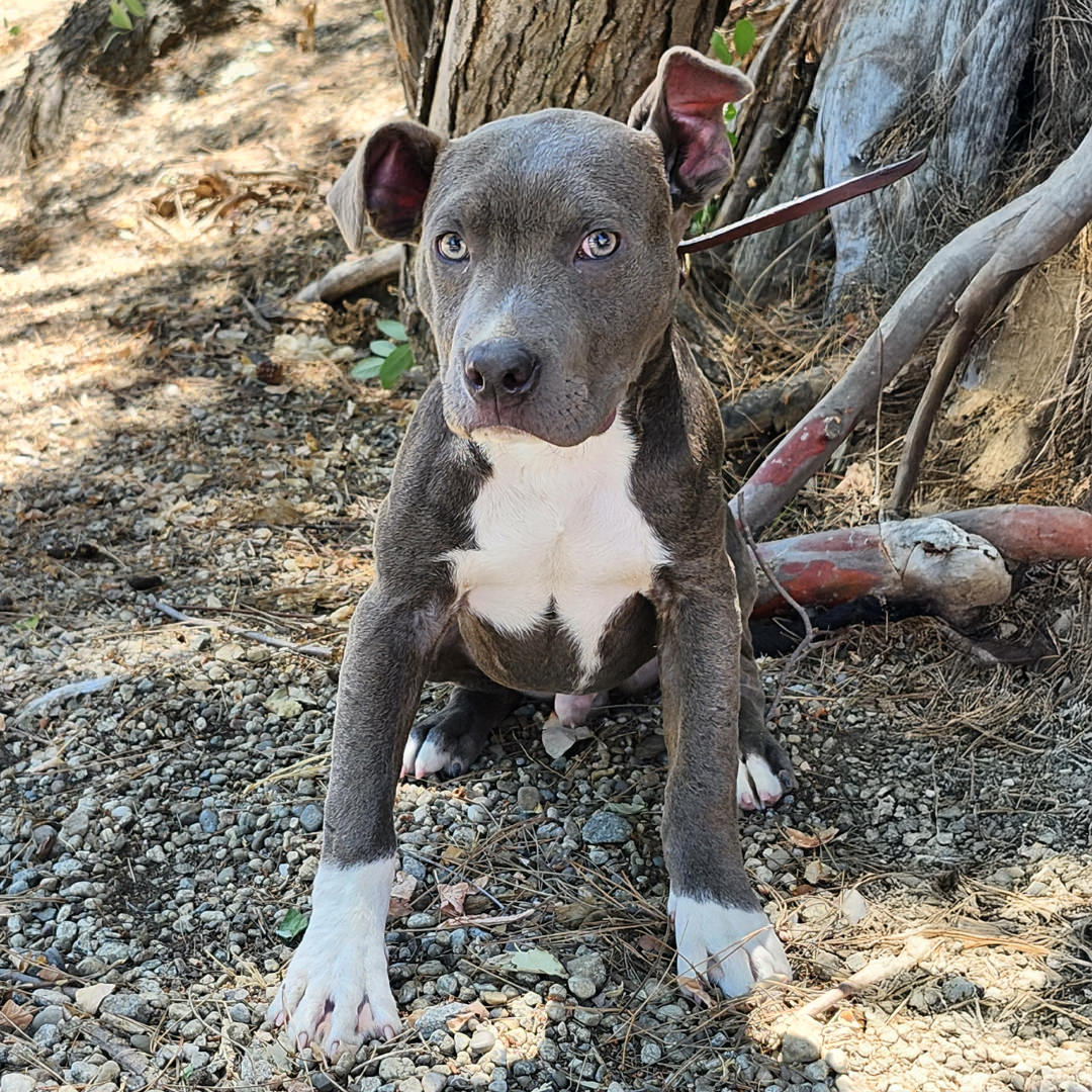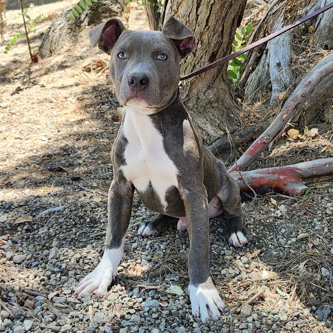 James is a 4-month-old pit bull puppy with a gorgeous gray-and-white coat and the sweetest puppy eyes. He’s one of four littermates — Sophie, Lola, and Gino — all with that irresistible puppy charm. James is in his playful, cuddly stage and ready to learn all about the world with a loving family by his side.