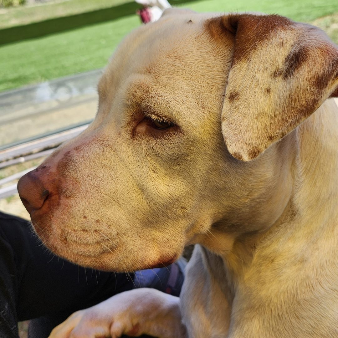 He takes treats gently, is easy to leash, and enjoys his walks. In the play yard, he shows off his lap‑dog tendencies by settling comfortably onto a welcoming lap and quietly watching the scenery, perfectly relaxed and happy to be close. He’ll ask for pets and scratches with a sweet, gentle charm.